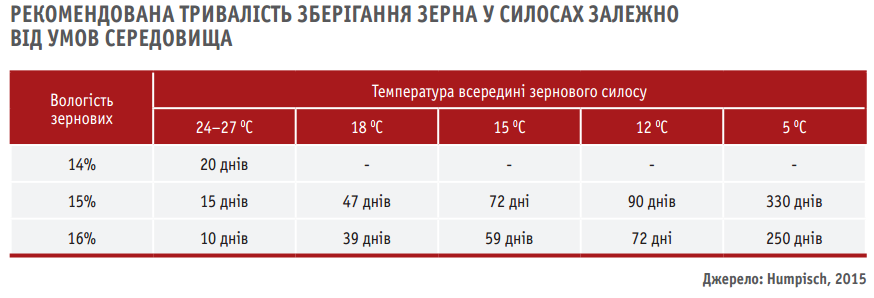 Якщо зерно зберігають у власних силосних елеваторних спорудах, розрахованих на понад 500 т зерна, необхідно будувати систему вентиляції. При цьому температура повітря, яке подається у приміщення, має бути на 60 С нижчою за температуру зерна. Оптимальна кратність обміну повітря (незалежно від вологості) —15 м3 та 1 м3 зерна. Зважайте також на рекомендовані норми часу зберігання зерна залежно від вологості й температури в силосі.