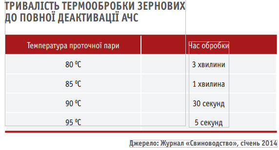 Термічну обробку корму традиційно вважають найефективнішим методом знезараження корму. Це твердження справедливе, зокрема, коли йдеться про інактивацію збудника АЧС. Це довели експериментально. Так, ультрафіолетове опромінення дворазово впродовж години, опромінення електромагнітним полем (4, 6 та 9 кГц) сумарно протягом 6 годин, а також озонування упродовж 2-ох, 4-ох, 6-и та 18-и годин не дали бажаного результату. На відміну від термообробки, однак лише за умови правильного співвідношення температури і тривалості.