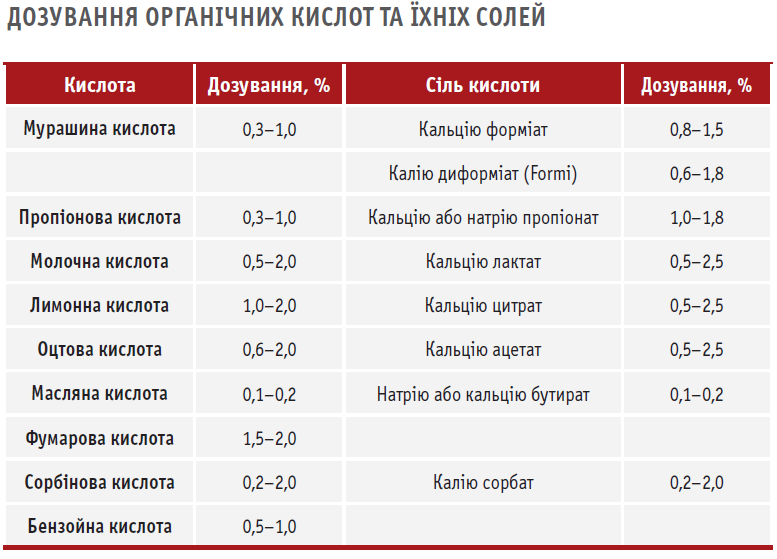 Серед основних кислот, які застосовують у свинарстві — мурашина, пропіонова, молочна, фумарова, лимонна, оцтова, масляна, сорбінова, бензойна, а також солі деяких із них. Порівняно з вільними кислотами, перевага солей (наприклад, форміату кальцію) в тому, що вони у твердому стані, практично без запаху, мають меншу корозійну активність. Тому солі простіші у використанні. Крім того, навіть високі дози не мають негативного впливу на кількість корму, яку споживають поросята.